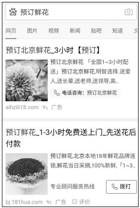 移動(dòng)搜索廣告其實(shí)是競(jìng)價(jià)推廣廣告的另一種投放形式,即在移動(dòng)端投放的競(jìng)價(jià)廣告。由于移動(dòng)設(shè)備屏幕較小,所以這樣的廣告必須短小、相關(guān)性較高,這樣才能吸引用戶點(diǎn)擊進(jìn)入。例如,網(wǎng)民用手機(jī)百度搜索“預(yù)訂鮮花”,如圖13-2所示。通過(guò)這種方式就可以找到附近的鮮花店,訂購(gòu)自己需要的鮮花。
