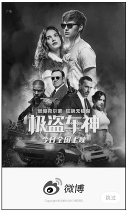 展示類廣告即廣告商主動(dòng)向用戶展現(xiàn)的廣告,展示類廣告包括圖片廣告、文字廣告、Banner廣告、開(kāi)屏廣告、插屏廣告等。展示類廣告在移動(dòng)互聯(lián)網(wǎng)中十分普遍,例如手機(jī)APP中的Banner廣告、開(kāi)屏廣告等形式,展現(xiàn)時(shí)會(huì)巧妙地避開(kāi)用戶對(duì)應(yīng)用的正常體驗(yàn),因而廣告點(diǎn)擊率較高,深受廣告主的喜愛(ài)。圖13-3所示為新浪微博開(kāi)屏廣告。