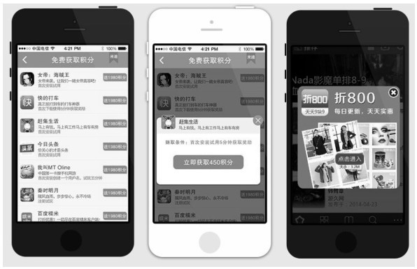 積分墻廣告是除Banner廣告、插屏廣告之外另一種常見(jiàn)的移動(dòng)廣告形式,它是由第三方移動(dòng)廣告平臺(tái)提供給應(yīng)用者的一種新型移動(dòng)廣告盈利模式。積分墻是一個(gè)應(yīng)用內(nèi)展示各種積分任務(wù)(如下載應(yīng)用、注冊(cè)、填表等),以供用戶完成任務(wù)獲得積分的頁(yè)面。用戶在嵌入積分墻的應(yīng)用內(nèi)完成任務(wù),該應(yīng)用的開(kāi)發(fā)者就能得到相應(yīng)的收入,目前積分墻主要支持Android和iOs平臺(tái)。圖13-5所示為積分墻廣告。